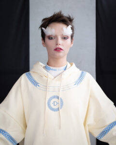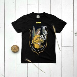 In the morning, the angel is gone, but folded next to Saint Daniel, his vestments and his bag are now blessed by the Angel’s holy seals, and he finds the following note “My pilgrim, I have to fly away, but I left my blessing, as I believe you may need it on your journey, just tag me if you wear it on instagram please. You must now travel 3 days and 3 nights to the North, following the sun and the moon, and stop only when you reach the building that is made of that which you wear. I forgot to leave a pin on Google maps, so unfortunately that’s as good as my explanation can be. Soon we will meet again”